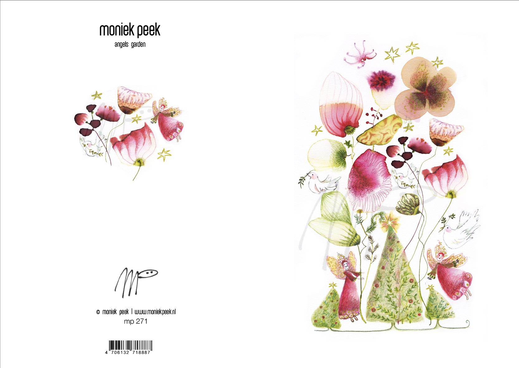 Artikelcode MP 271 ‘Angels garden’ Een kersttuin met lieftallige engelen? Een kaart waarbij de een prachtige kerst met een wens naar vrede de boodschap is. 14 x 17 cm. Gevouwen 300 gr.Tinteretto kaart inclusief wit watteau 90 grs. envelop. Netjes verpakt in milieuvriendelijk foliezakje.