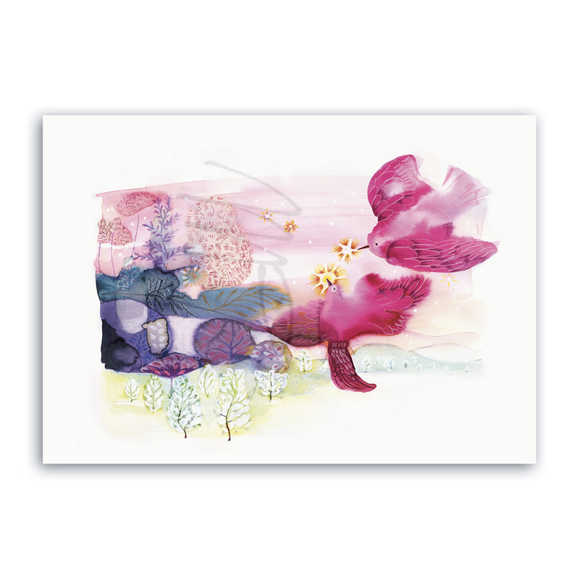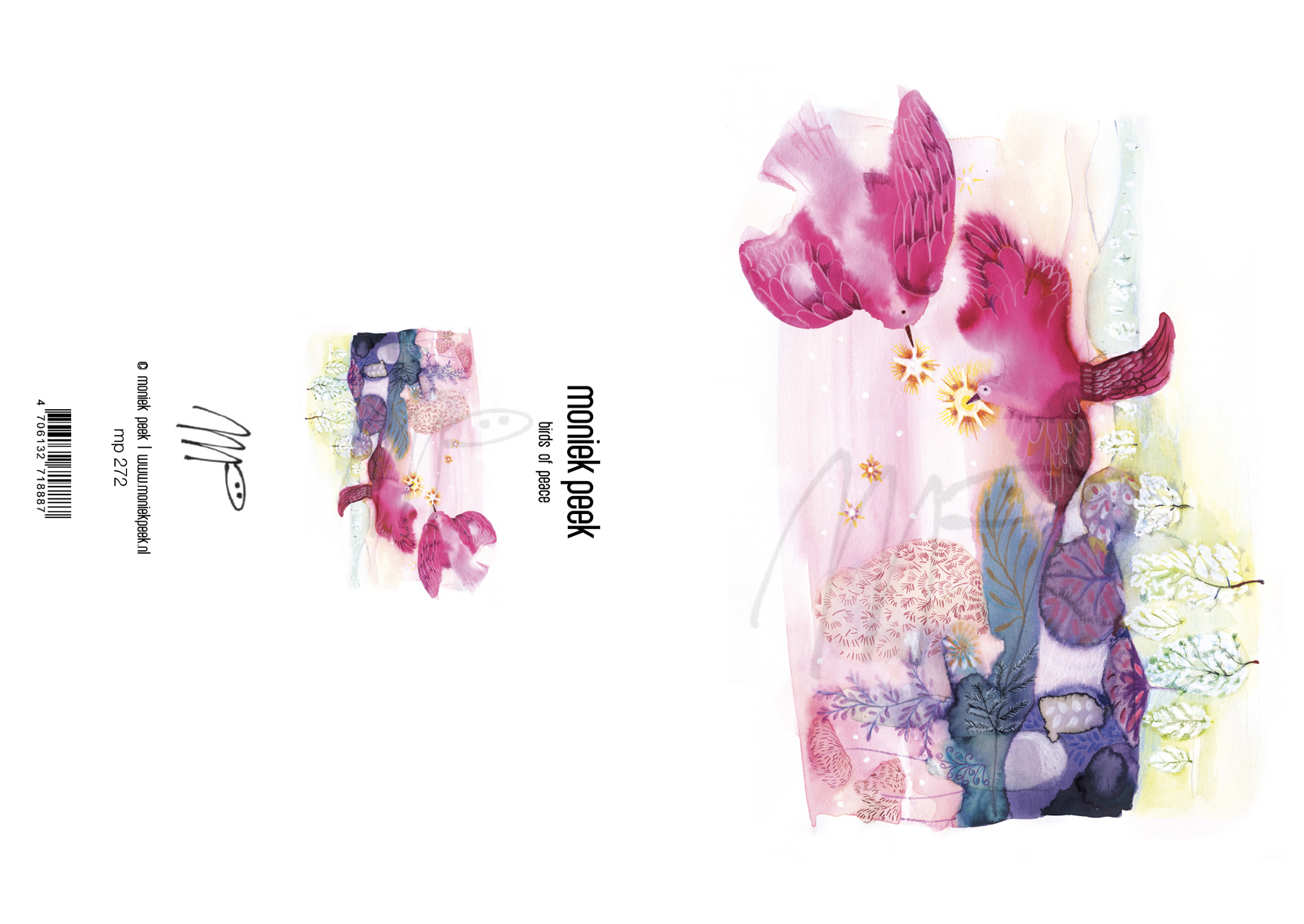 Artikelcode MP 272 ‘Birds of piece’ Twee paradijsvogels welke het licht brengen. Een kaart waarbij twee prachtige vogels met een wens naar vrede de boodschap is. 14 x 17 cm. Gevouwen 300 gr.Tinteretto kaart inclusief wit watteau 90 grs. envelop. Netjes verpakt in milieuvriendelijk foliezakje.