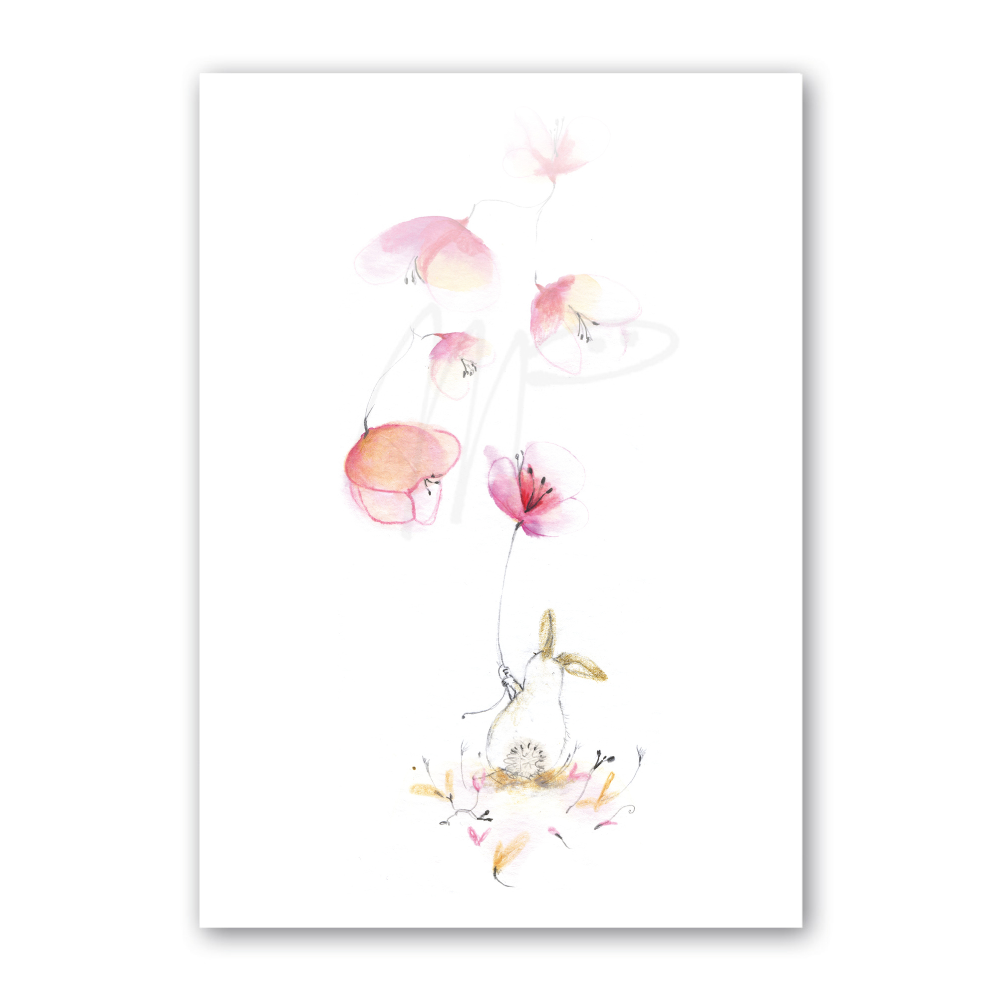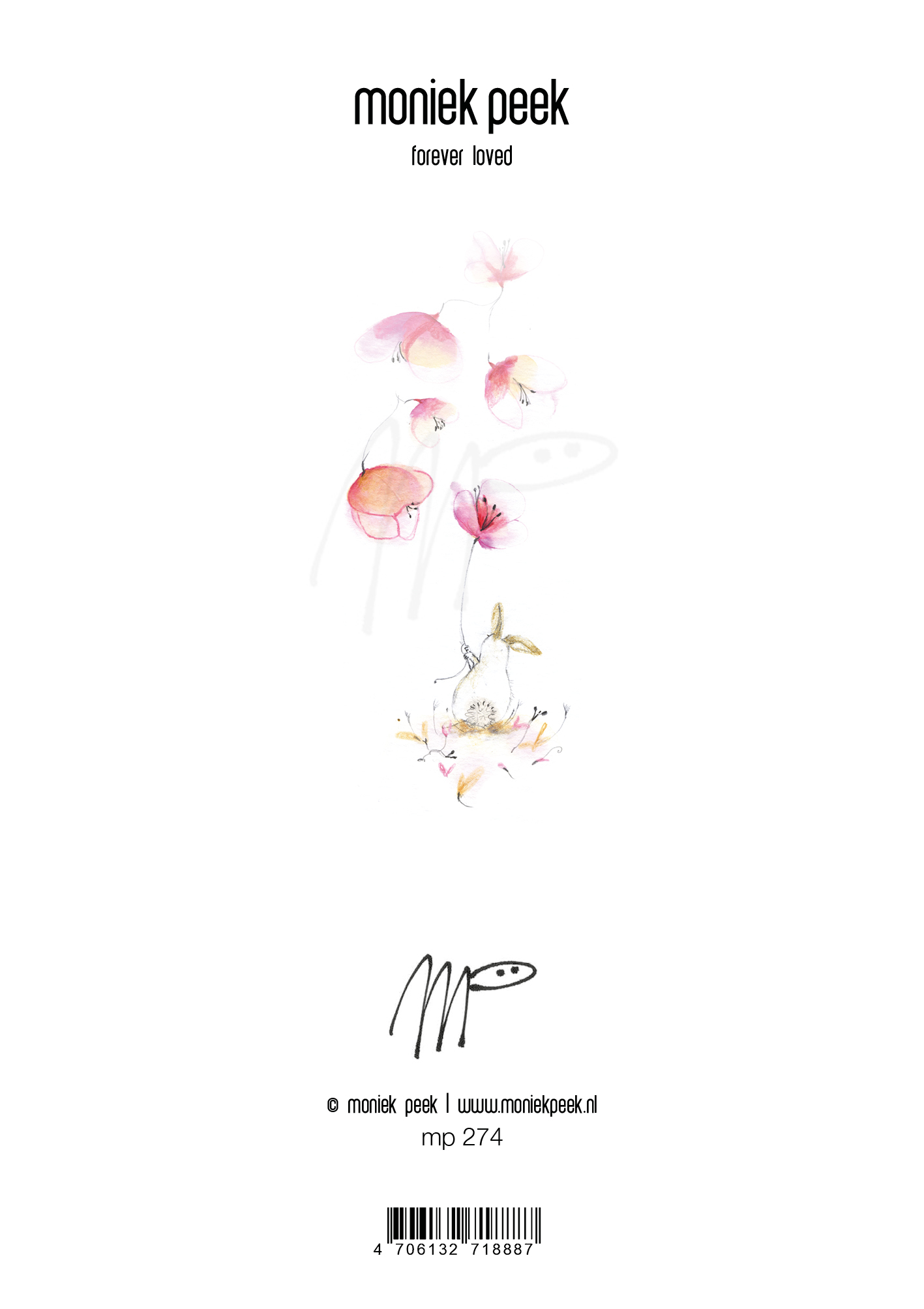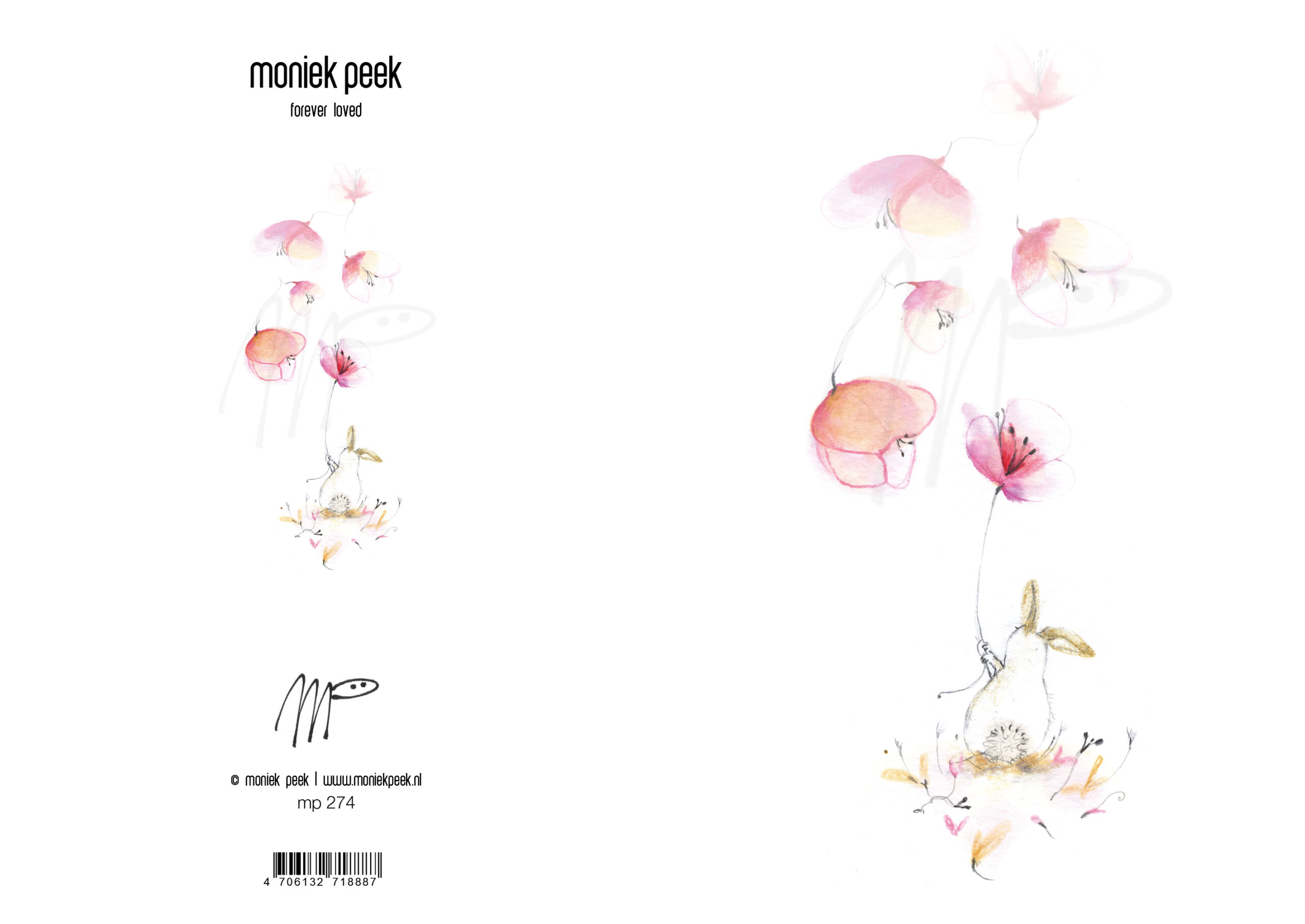 Artikelcode MP 274 ‘Forever loved’ Dit lieve konijn laat bloemblaadjes los waaien Een mooie kaart bij liefde, en loslaten.14 x 17 cm. Gevouwen 300 gr.Tinteretto kaart inclusief wit watteau 90 grs. envelop. Netjes verpakt in milieuvriendelijk foliezakje.